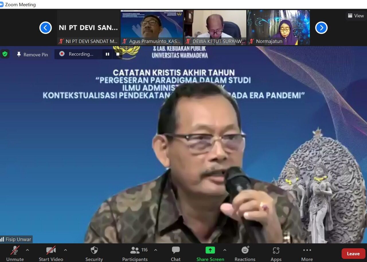 Dekan Fisip Unwar Drs. I Wayan Mirta, M.Si., mengatakan Administrasi Publik mengalami perkembangan pesat hingga saat ini. Pengelolaan negara yang tidak sesuai harapan masyarakat dan dianggap gagal menjadi ide awal administrasi publik mengalami pergeseran paradigma. Pergeseran tersebut akibat adanya ketidakpuasan dengan paradigma sebelumnya yang dianggap todak sesuai dengan pengelolaan negara. Kegiatan catatan kritis ini bertujuan untuk mengetahui bagaimana pergeseran paradigma dalam Ilmu Administrasi Publik. Ia berharap kegiatan seperti ini dapat berlanjut kedepannya baik itu dalam bentuk kegiatan kuliah tamu, seminar nasional, maupun seminar internasional. Kegiatan ini tentu tidak cukup hanya dalam bentuk webinar, namun ide-ide kritis serta pemikiran kritis lainnya mampu dituangkan oleh dosen dan mahasiswa Fisip Unwar dalam bentuk tulisan di media massa, jurnal maupun prosiding sehingga output kegiatan seperti ini dapat dijadikan poin tersendiri bagi lembaga kita khususnya akreditasi.