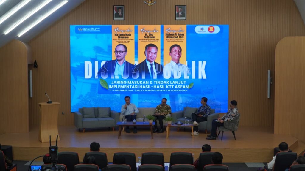 Denpasar(warmadewa.ac.id) – Fakultas Ilmu Sosial dan Ilmu Politik (FISIP) Universitas Warmadewa bekerja sama dengan Direktorat Jenderal Kerja Sama ASEAN, Kementerian Luar Negeri Republik Indonesia menyelenggarakan kegiatan “Diskusi Publik: Jaring Masukan dan Tindak Lanjut Implementasi Hasil-Hasil KTT ASEAN” bertempat di Aula Ajnadewi, Gedung FTP Universitas Warmadewa.